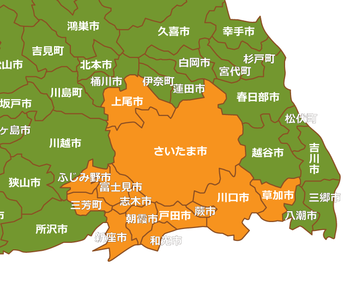 さいたま・上尾・朝霞・川口・志木・草加・戸田・新座・富士見・ふじみ野・和光・蕨市、三芳町